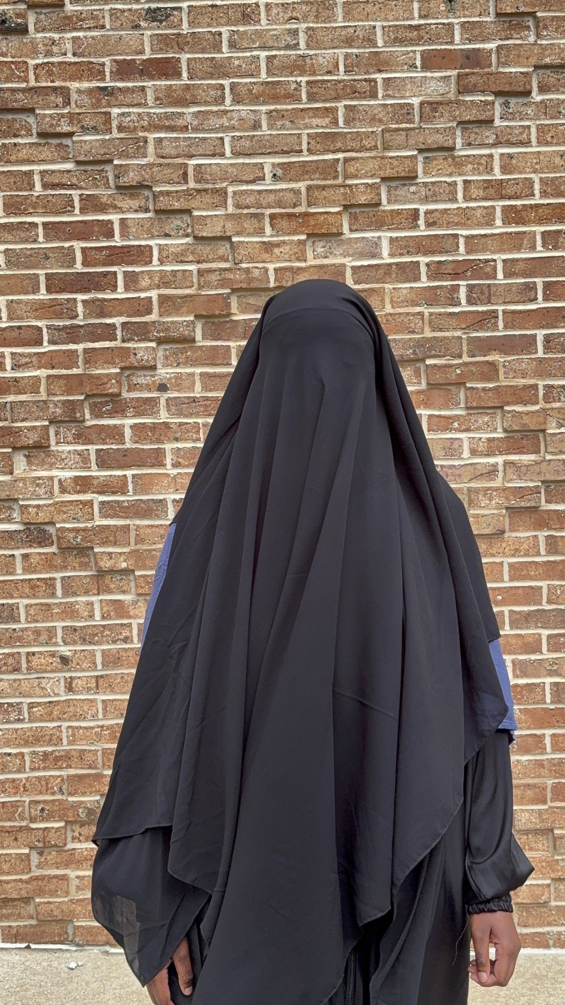 This niqab features a two-layer back design for elegant coverage and a smooth drape. When worn, the back naturally falls into two distinct layers — the first measuring approximately 40 inches, and the second extending to about 45 inches. This layered structure provides extra opacity, enhanced modesty, and a flowing, refined look.