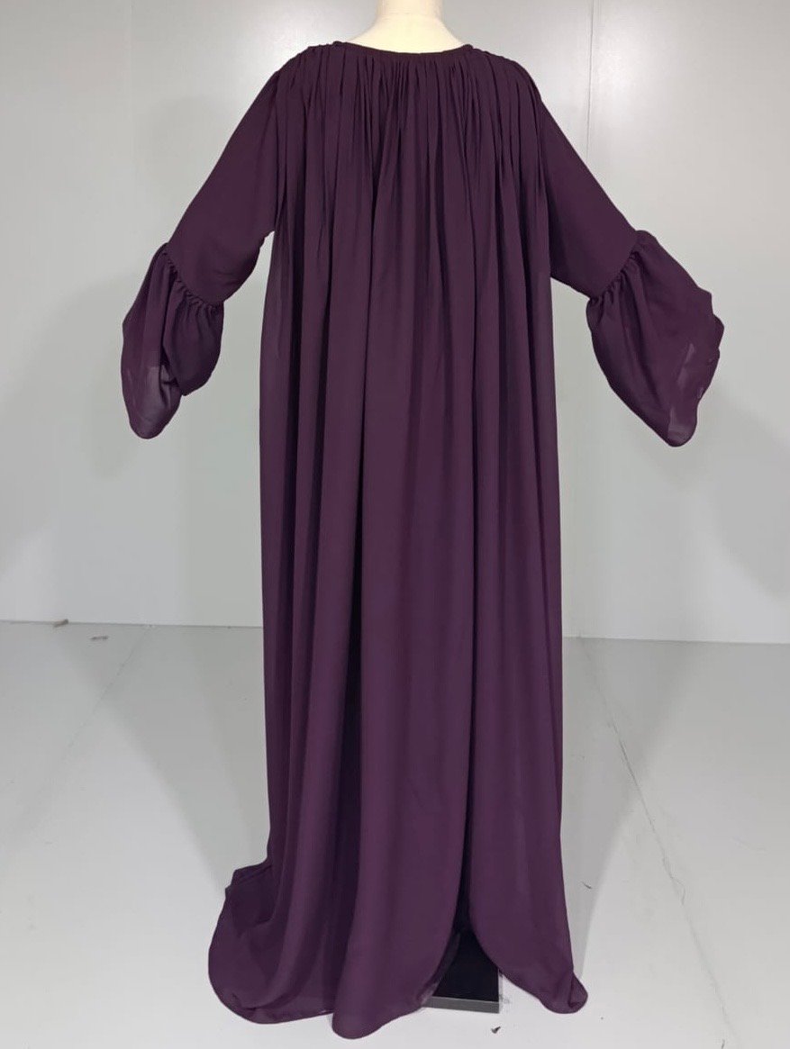 A timeless piece that exudes effortless elegance. Crafted in a rich plum hue, this abaya features delicate pleats cascading down the back for a graceful flow with every step. The frappe-style sleeves add a soft, feminine touch—perfect for both everyday wear and special occasions. Designed for modesty and movement, this abaya combines sophistication with comfort in the most beautiful way.